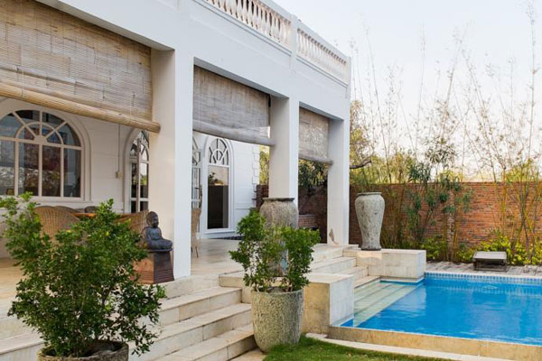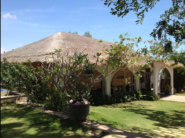 The main villa has 2 double rooms and one single room. Each room has a ceiling fan as well as air conditioning. The lounge and kitchen are combined into a fabulous open-plan living area with ‘double height’ ceiling, opening up onto a covered terrace for dining, right by the swimming pool.